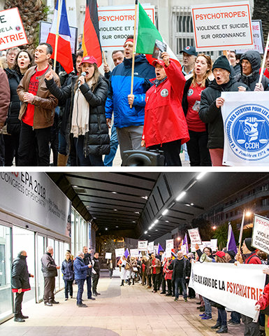 Para fazer com que os psiquiatras se sintam bem‑vindos, a CCHR França realizou um protesto à porta da frente do Centro de Convenções da Nice Acropolis com cartazes proclamando “Pare o Abuso Psiquiátrico” e “Psiquiatria: Barbaridade, Choques Elétricos, Chega.”